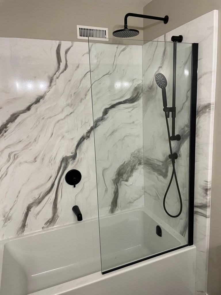 Our custom shower and tub surrounds are templated onsite to ensure and perfect fit. our substrate is water proof and we go one step further to apply a water proof membrane to the wall behind the shower panels for added protection. As the panels are installed, the entire panel is the sealed with silicone for a complete water proof finish. No grout to clean!