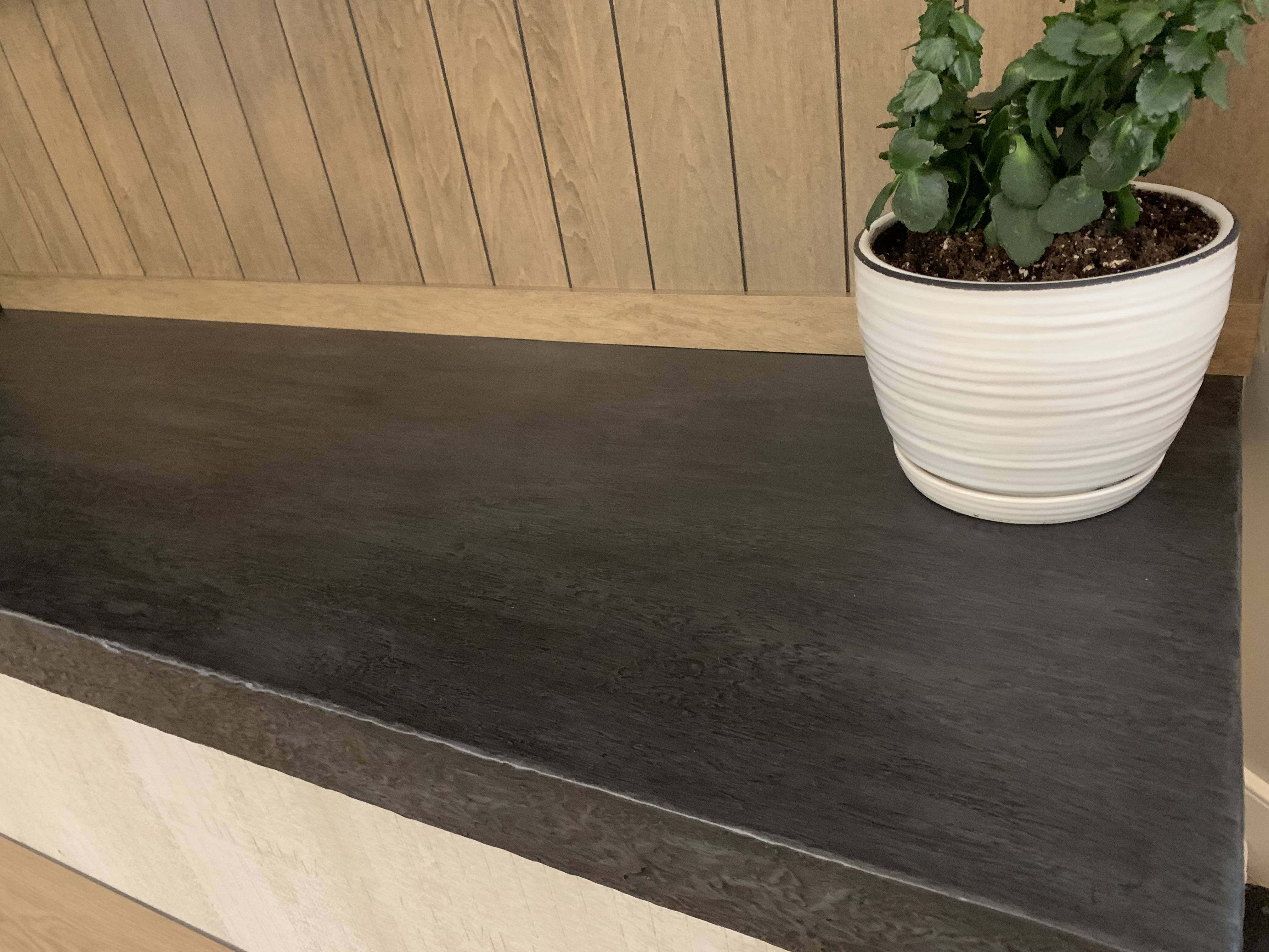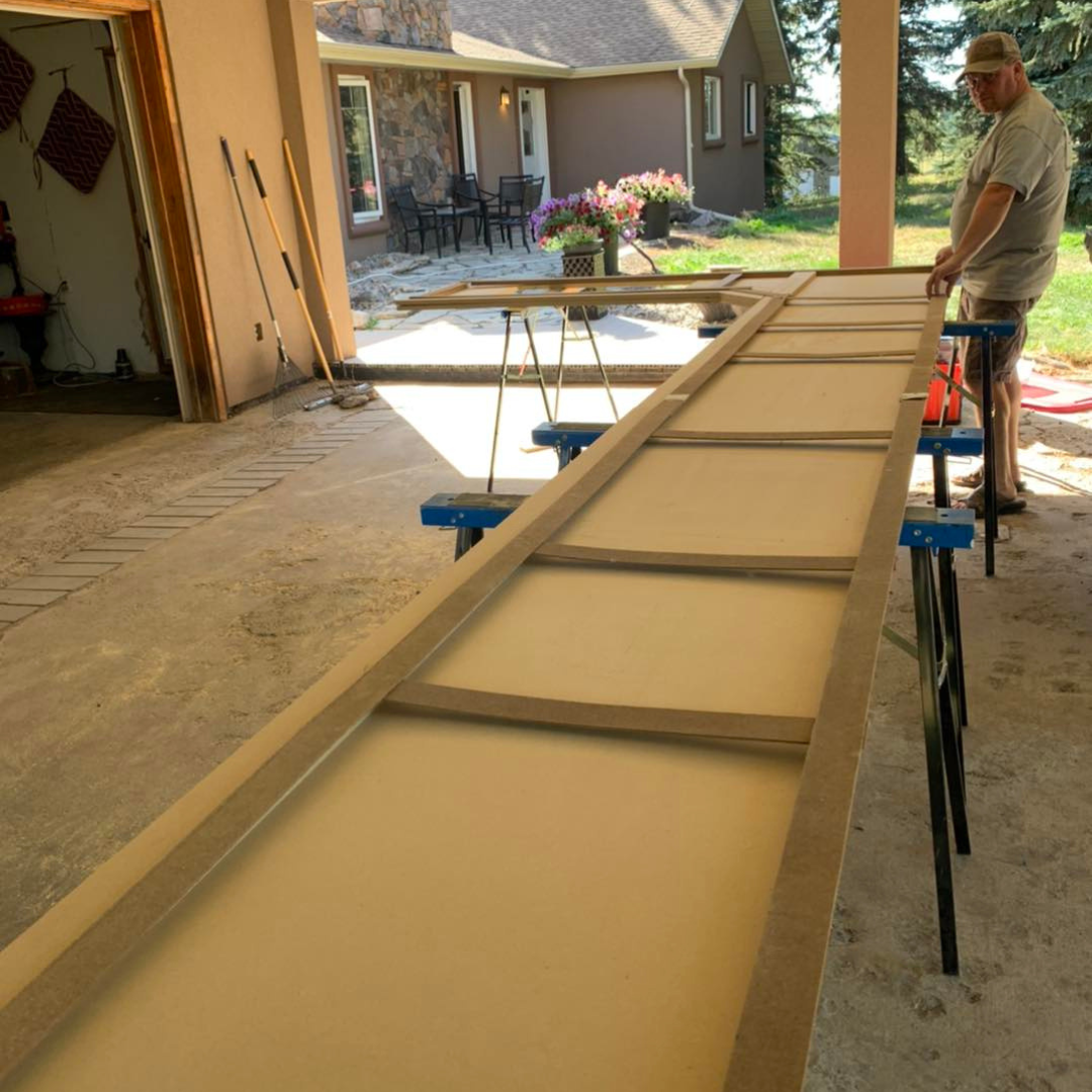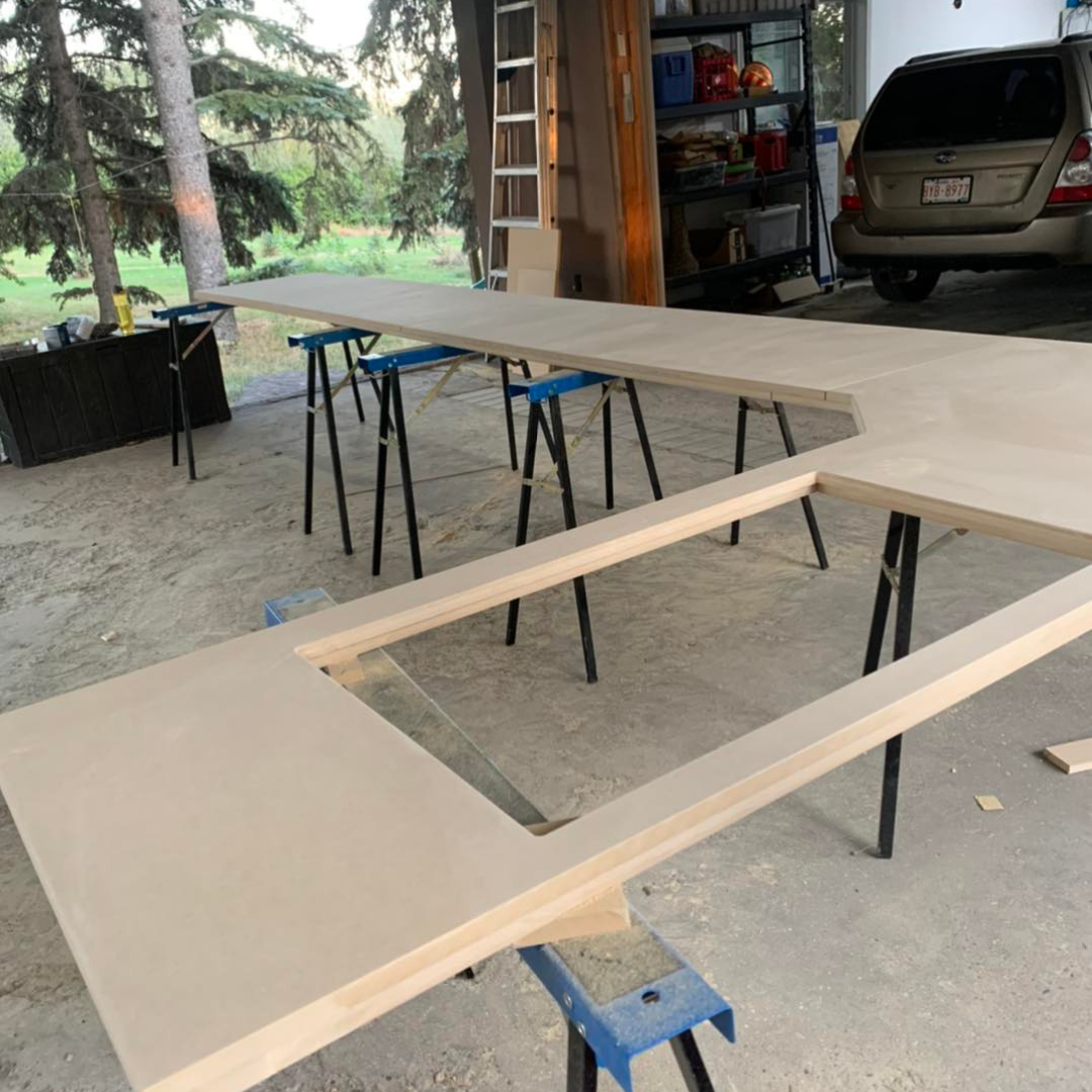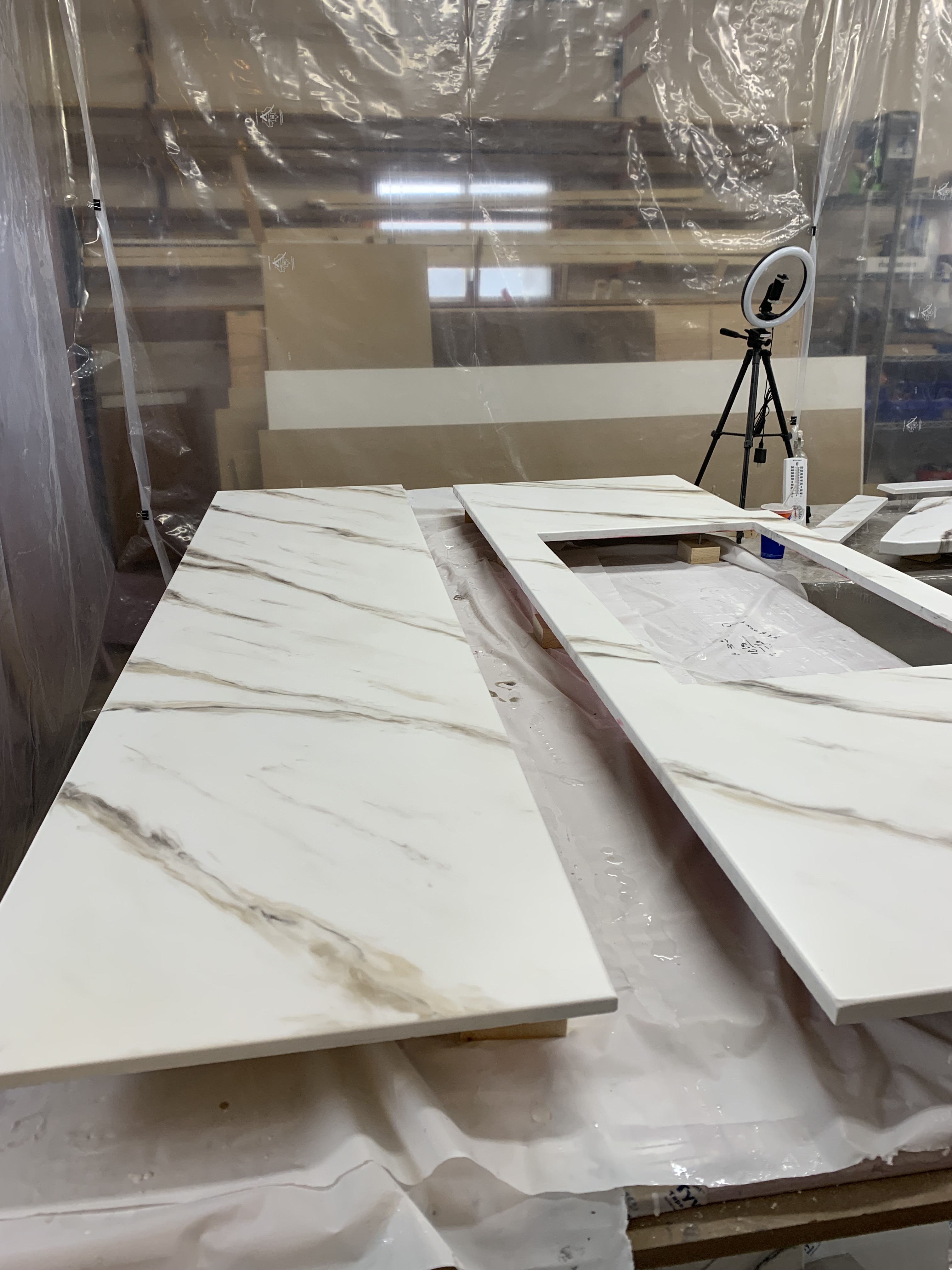 Once we template your project we return to our fabrication shop to begin the build. We use a variety of substrates for our projects which are selected based on the function of the piece and its intended use. We are able to customize shapes for complex designs such as kitchen islands, fireplace features and mantles, furniture, showers, undermount or apron sinks, and much more. All of our high-use surfaces such as kitchen counter tops and vanities have an additional topcoat that comes in a matte or gloss finish. This topcoat adds a layer of durability, scratch and heat resistance, and keeps your custom surface looking great and maintenance free.