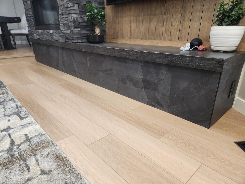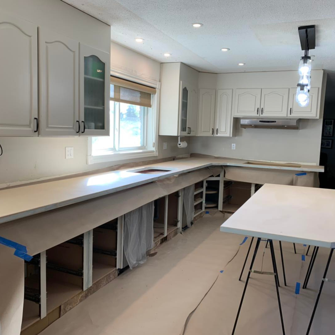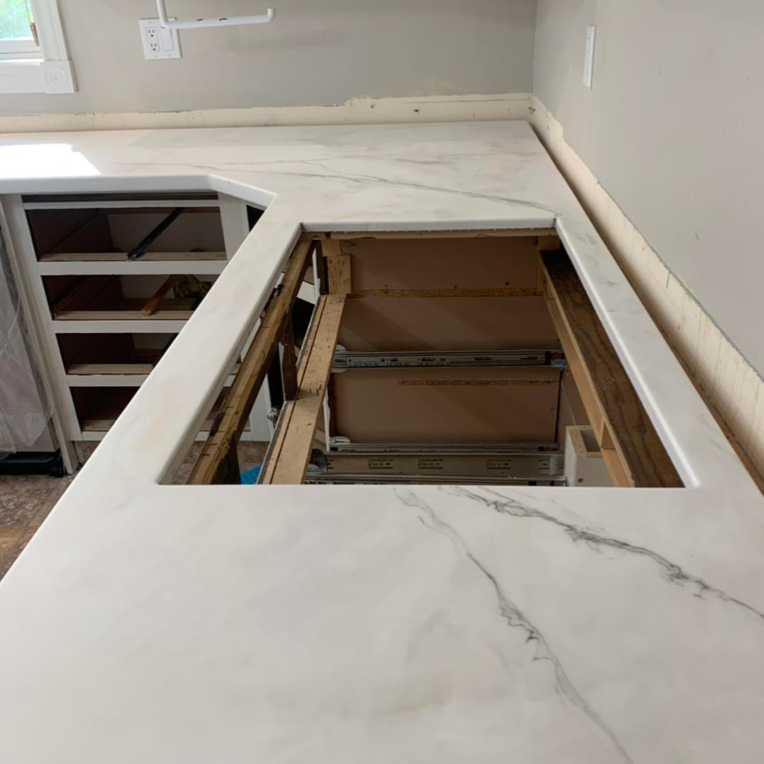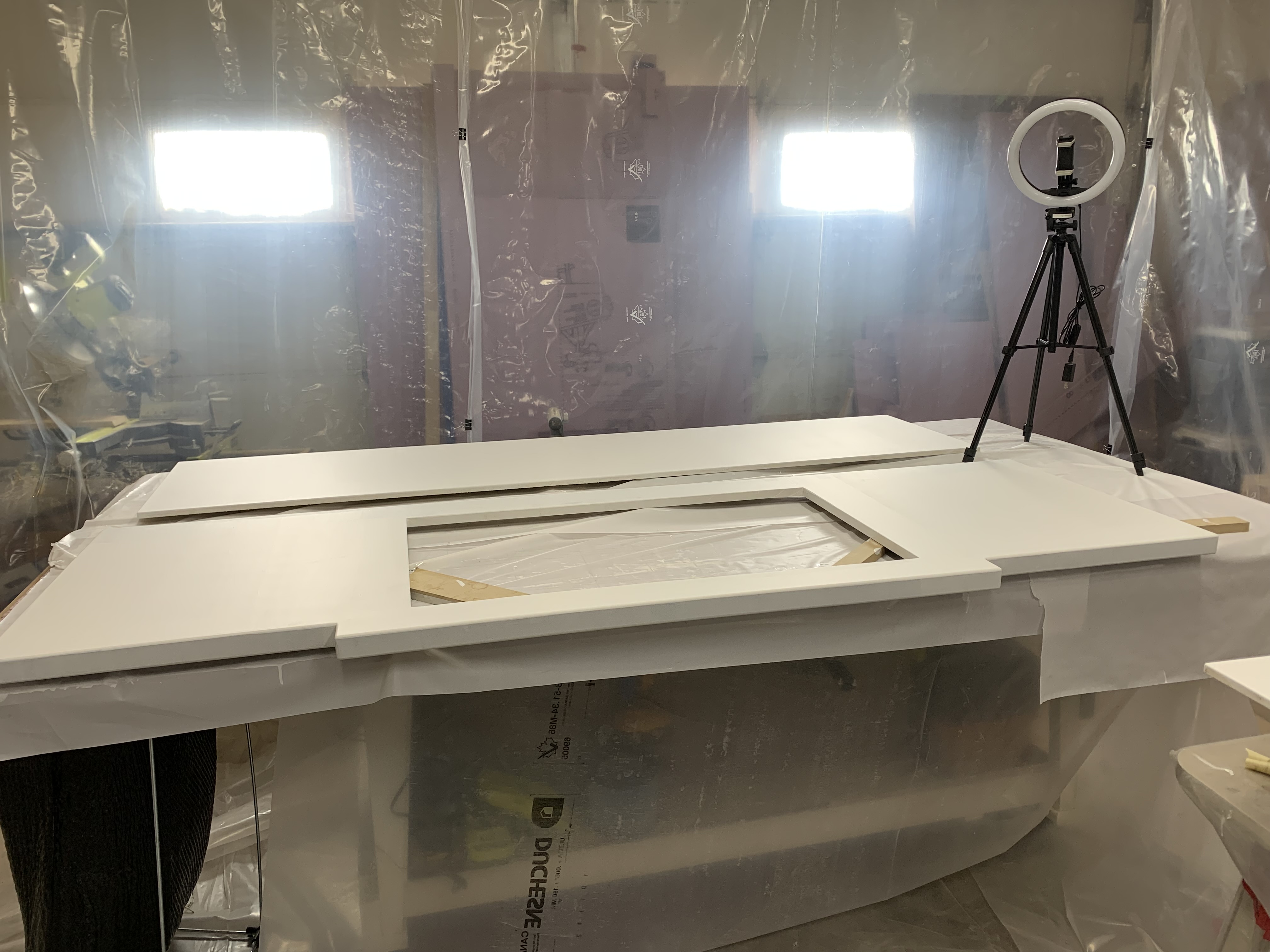 Once we template your project we return to our fabrication shop to begin the build. We use a variety of substrates for our projects which are selected based on the function of the piece and its intended use. We are able to customize shapes for complex designs such as kitchen islands, fireplace features and mantles, furniture, showers, undermount or apron sinks, and much more. All of our high-use surfaces such as kitchen counter tops and vanities have an additional topcoat that comes in a matte or gloss finish. This topcoat adds a layer of durability, scratch and heat resistance, and keeps your custom surface looking great and maintenance free.