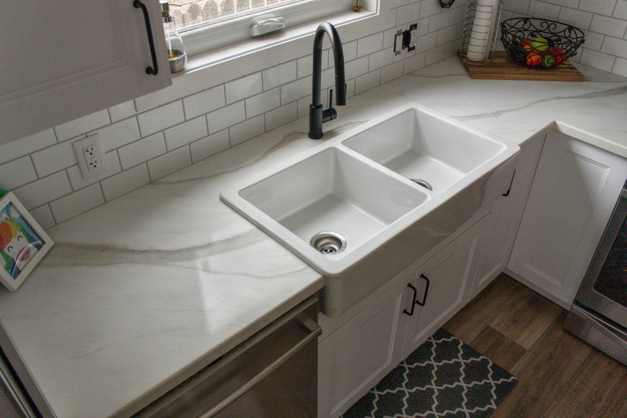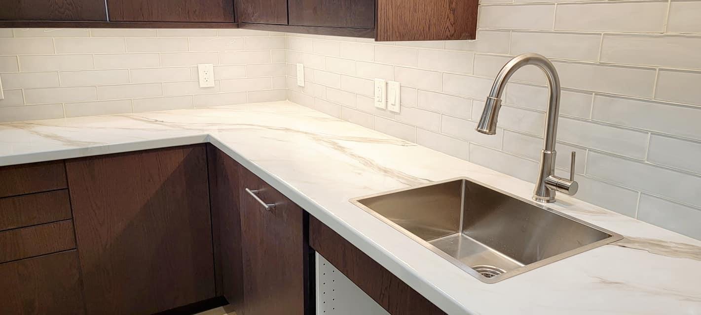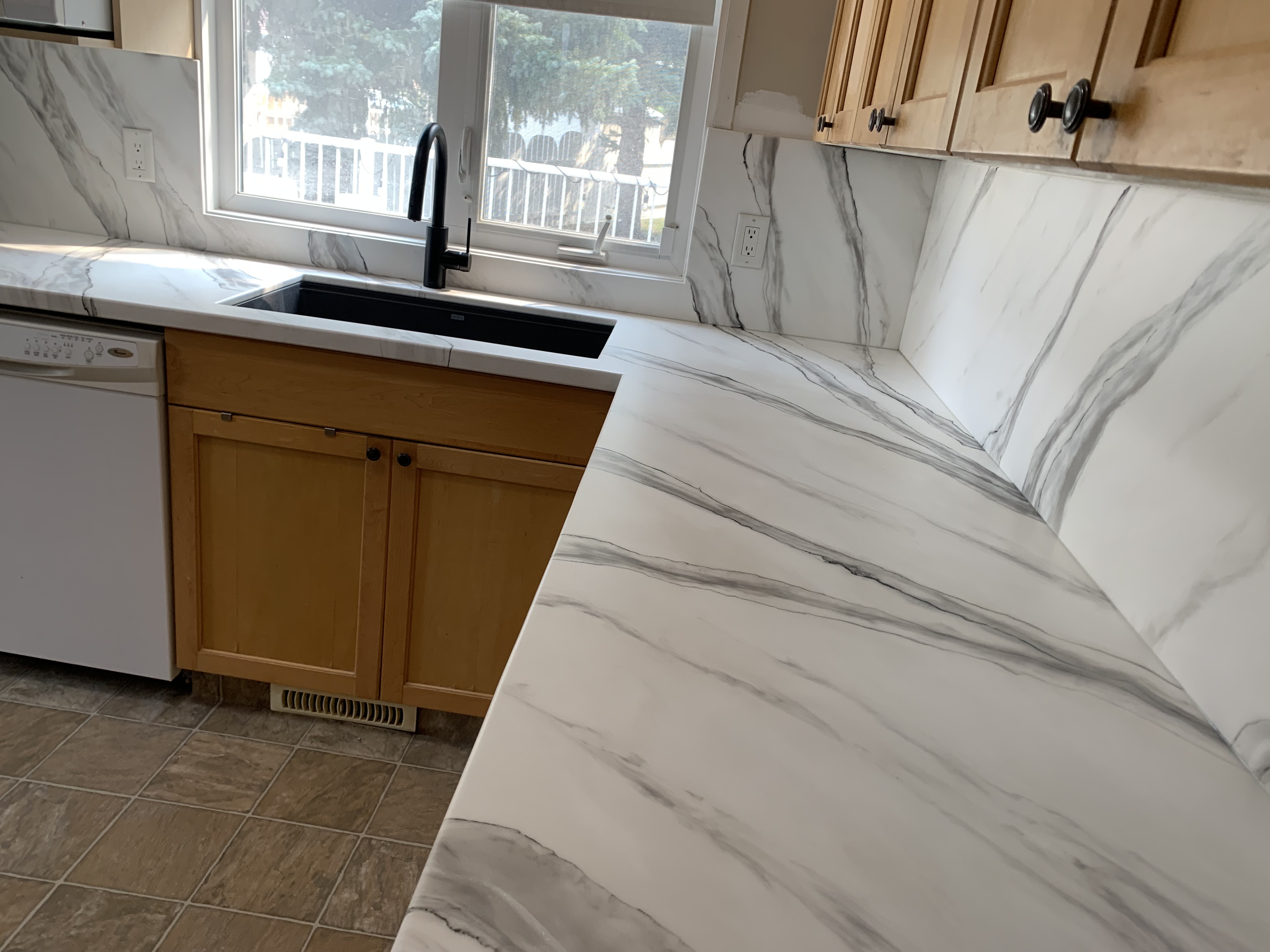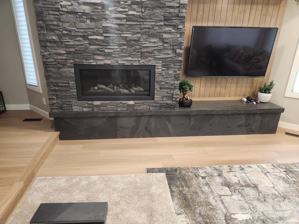 Once we template your project we return to our fabrication shop to begin the build. We use a variety of substrates for our projects which are selected based on the function of the piece and its intended use. We are able to customize shapes for complex designs such as kitchen islands, fireplace features and mantles, furniture, showers, undermount or apron sinks, and much more. All of our high-use surfaces such as kitchen counter tops and vanities have an additional topcoat that comes in a matte or gloss finish. This topcoat adds a layer of durability, scratch and heat resistance, and keeps your custom surface looking great and maintenance free.